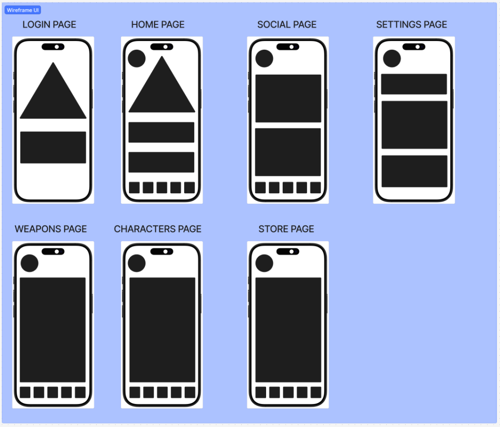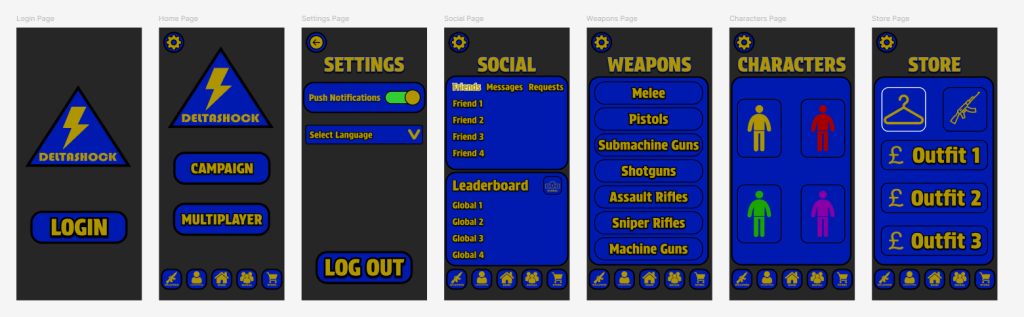 To begin with, I chose the main pages that are required for my app; Login, Home, Settings, Social, Weapons, Characters and Store. Besides from the login page, the rest of the main pages are interconnected to allow easy access between them instead of the requirement of heading back to the home page.